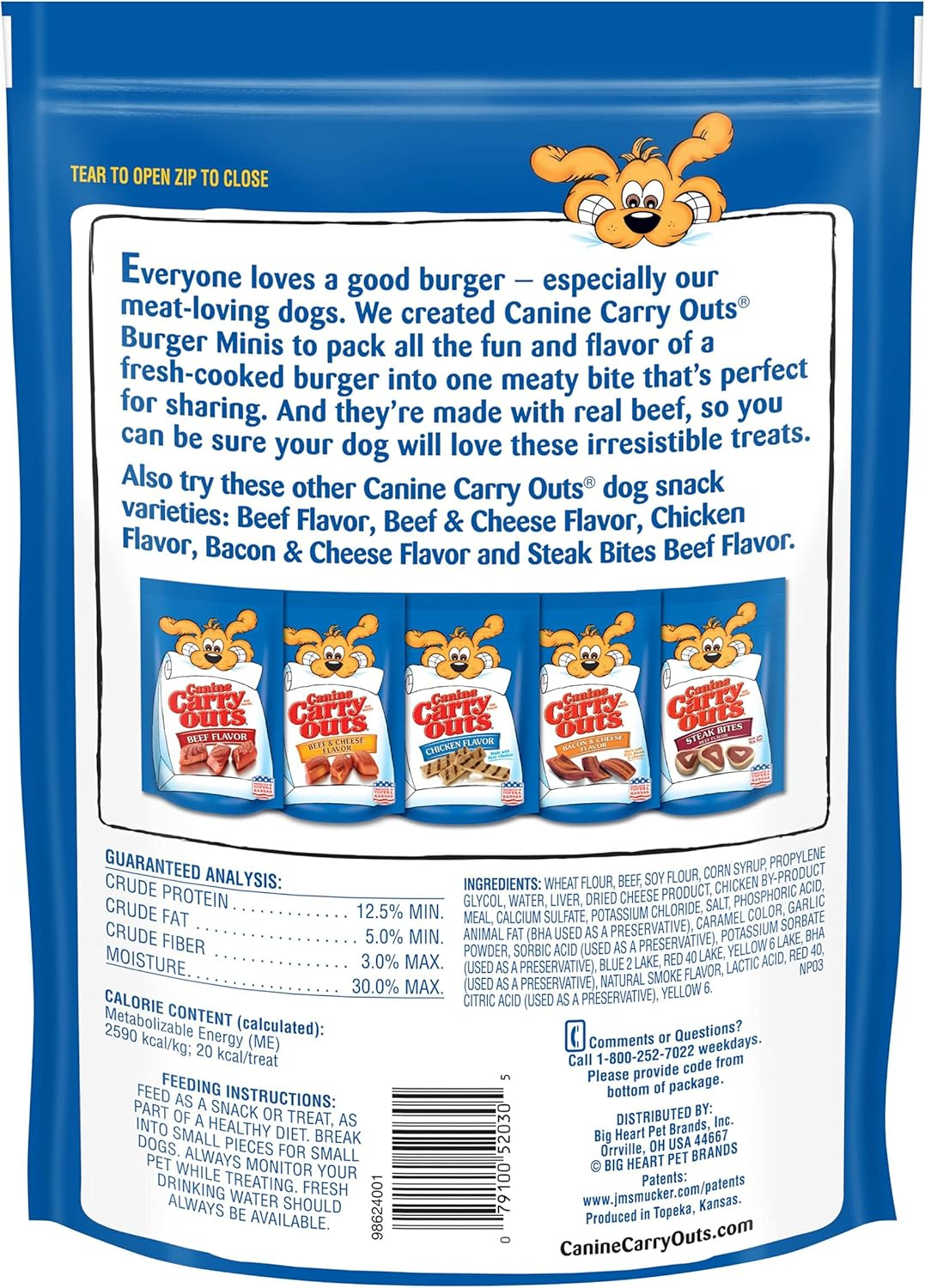 - Contains six (6) 22.5-ounce bag of Canine Carry Outs Burger Minis Beef Flavor dog treats