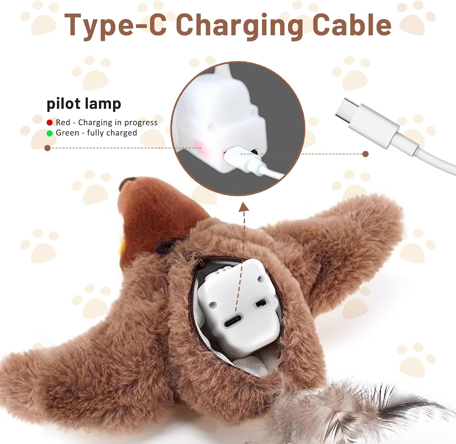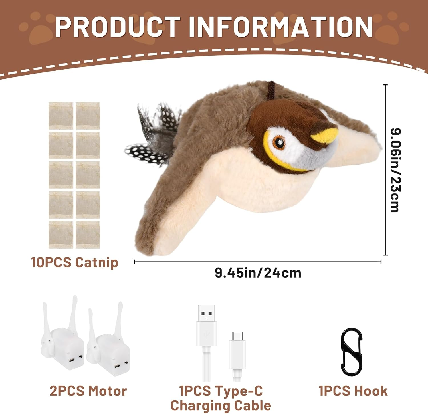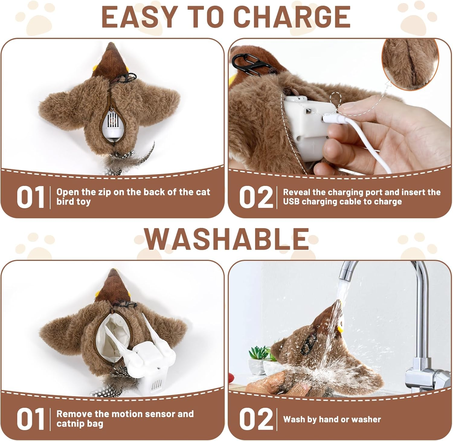 • Safe Material & Easy to Clean:This flapping bird cat toy Crafted with soft, durable plush and multi-textured feathers, the interactive cat toy withstands rough play while being gentle on paws, and the reinforced stitching ensures long-lasting use for daily interactive play. The fully detachable mechanism enables you easily remove and wipe down the plush body, making it convenient to clean.