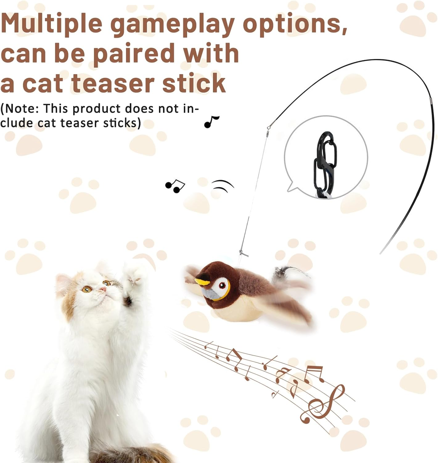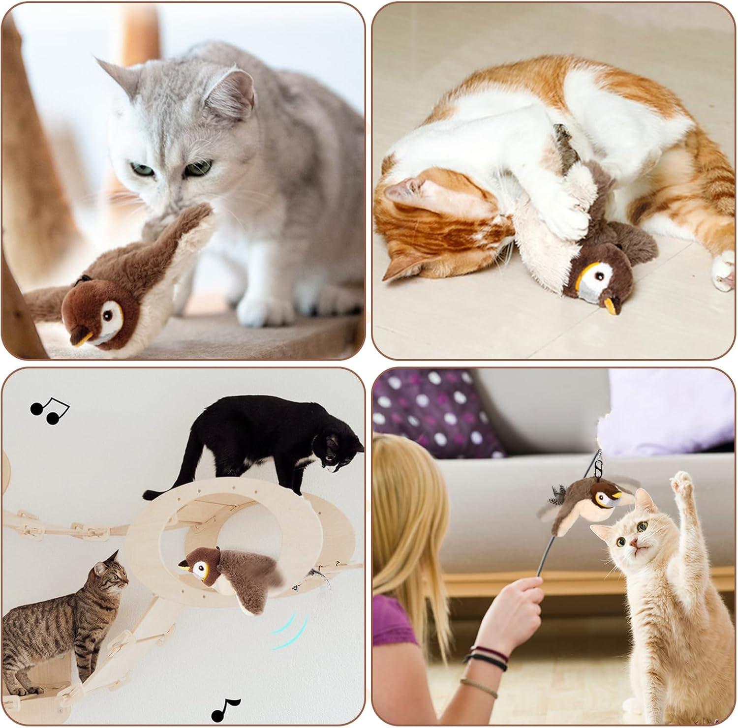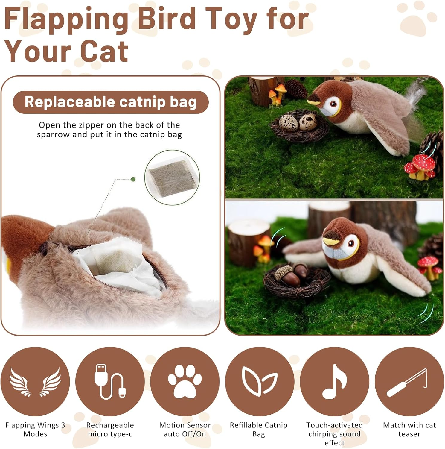 Flappy Bird Cat Toy, Interactive Catnip Toy with Flapping Wings Realistic Sparrow Chirp Tweet No Flying USB Rechargeable with Two Motor Motion Activated Hanging Flapping Bird for Indoor Cats