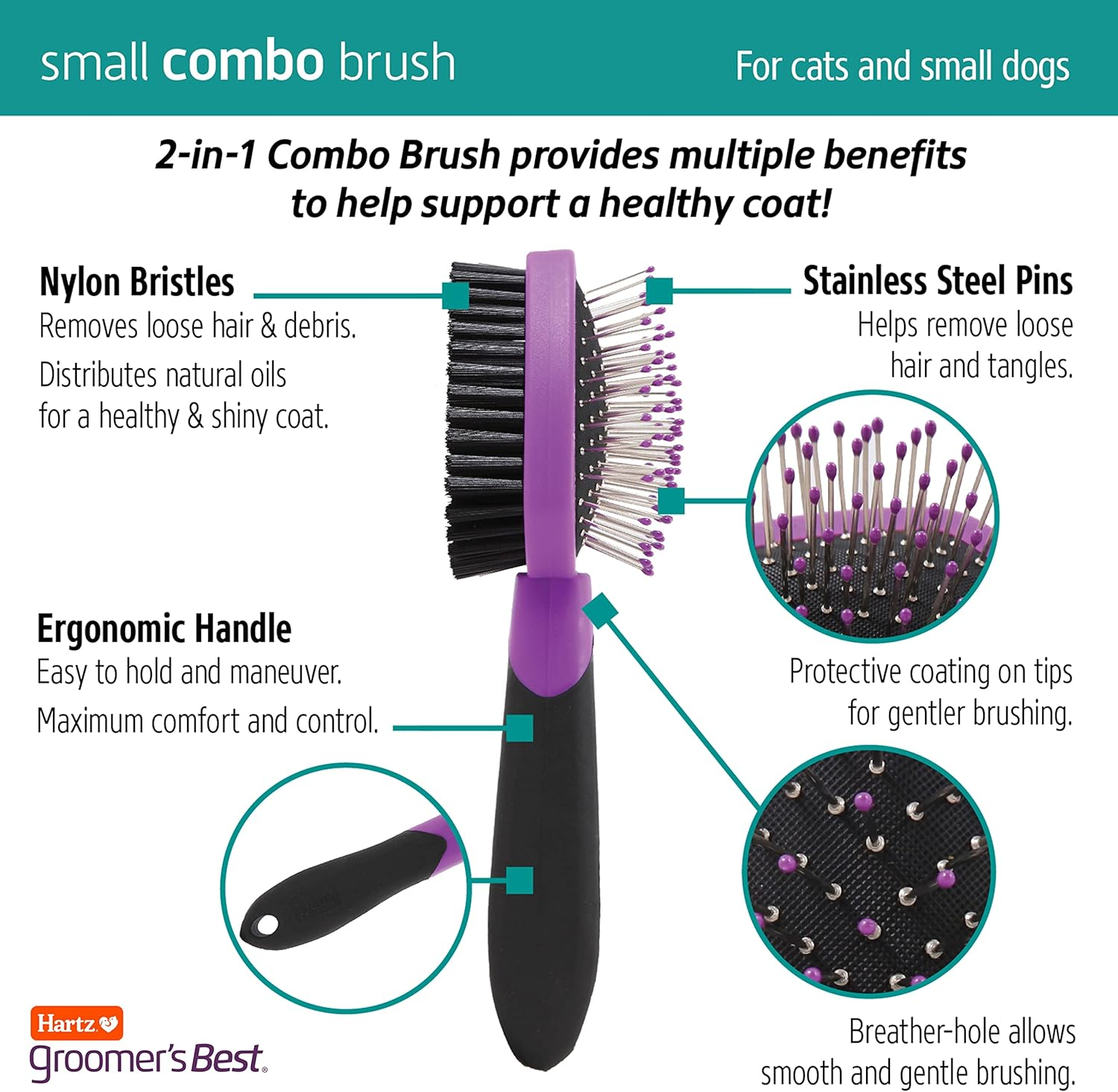 As a pet parent, it’s common to be floored by fur. Hundreds of wispy strands cling to anything they can grab hold of, and hairy tumbleweeds dance throughout your home, taking up residence in every nook and cranny. These are the indications that hours of endless vacuuming and sweeping have begun. If you feel like your pet is losing their fur faster than you can keep up with, it’s time to break the cycle and stop dreading shedding. The Hartz Groomer’s Best Small Combo Brush is developed with pawfessional groomers to truly be the cat’s meow. The fine stainless steel tips one on side feature a protective coating so they effectively and gently grab loose hair and excess fur while detangling and removing mats. The dense bristles on the reverse side help to distribute natural oils that keep your pet’s coat healthy and shiny. Your pet will enjoy being pampered to keep them looking and feeling their best.
