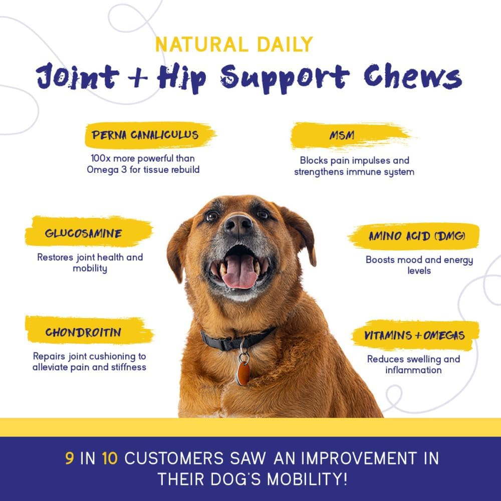 - 9 IN 10 SAW AN IMPROVEMENT IN THEIR DOG’S MOBILITY – Unlike other joint supplements, our unique blend has been proven to improve mobility in just four weeks! Our powerful blend of ingredients helps to cushion joints and promote cartilage to rebuild and alleviate discomfort. Just take it from our customers—9 out of 10 surveyed customers saw an overall improvement in their dog’s mobility.*