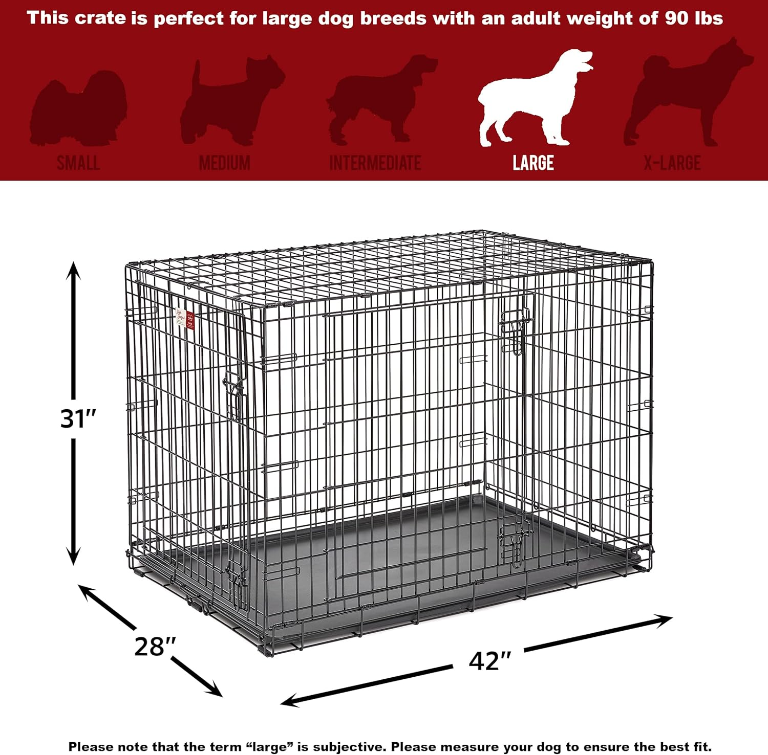 The Life Stages folding metal dog crate by MidWest Homes for Pets includes all of the features you will need to provide a convenient, safe & secure pet home for your best friend, from puppy to adulthood. This crate includes a divider panel allowing you to adjust the size of the living area as your puppy grows. The plastic leak-proof pan allows easy clean-up in the event of an accident. A strong plastic carrying handle is included for convenient portability, and rubber feet on the bottom of the crate protect the floors inside your home. We recently enhanced the safety and security of the Life Stages crate by adding locking tips on the slide-bolt latches to securely lock the door and patented Paw Block, which prohibits your dog from tampering with the door lock from the inside. MidWest Life Stages crates also feature patented rounded side clips that reduce possible sharp points to ensure a safe experience for you and your pet. Every Life Stages metal dog crate conveniently folds down flat for travel. The 42″ Life Stages (model 1642DDU) measures 42L x 28W x 31H inches and is suitable for “large” dog breeds. **Please note the term “largeā€ breed is subjective. For the best fit, we advise that you check the measurements of the dog crate and select a size that will be suitable for your dog’s ADULT weight and measurements. Your dog should be able to comfortably sit upright, lay down, and easily turn around inside the crate. When in doubt, we suggest you purchase a larger crate option. We at MidWest Homes for Pets understand that your dog is a part of your family; that’s why we ensure our dog crates are manufactured with the highest quality control standards to create a safe and secure home for your pet. Assembly and safety instructions are included; please read all safety instructions prior to use.