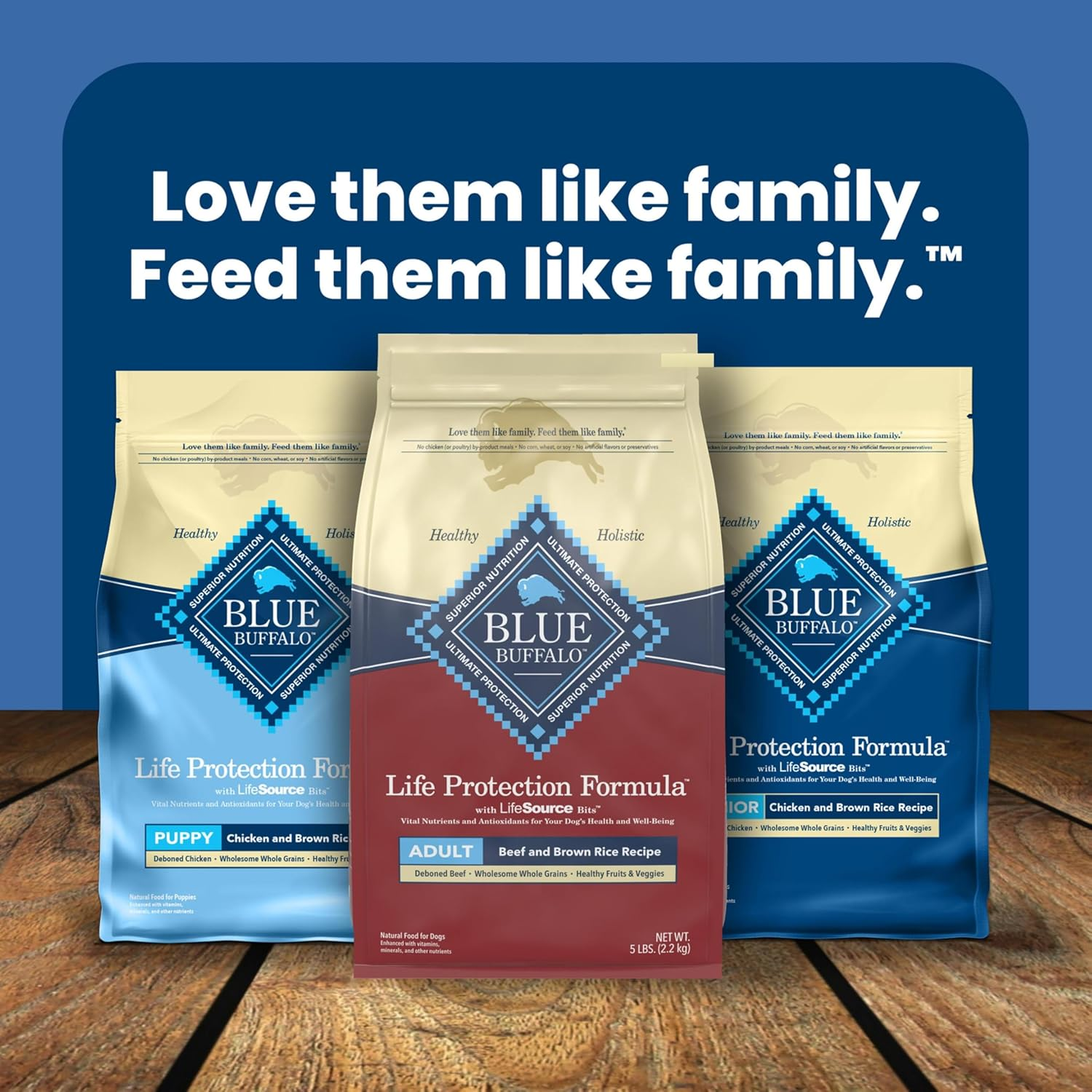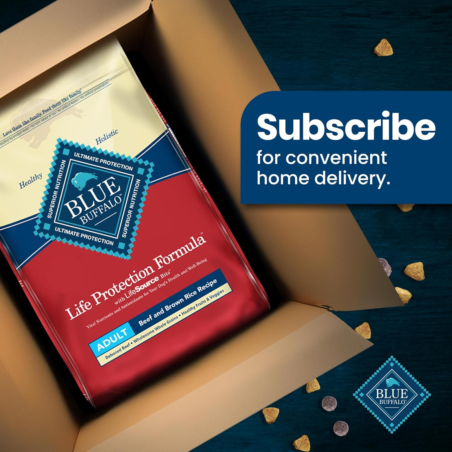 Formulated for the health and well-being of adult dogs, BLUE Life Protection Formula Beef and Brown Rice dry dog food is made with the finest natural ingredients enhanced with vitamins, minerals, and other nutrients. It’s a high-quality, balanced recipe you can both feel great about. Designed to help your dog thrive, this formula starts with real beef and contains no chicken (or poultry) by-product meals, no corn, wheat, or soy, and no artificial flavors or preservatives. Like all BLUE dry foods, BLUE Life Protection Formula includes exclusive, antioxidant-rich LifeSource Bits to support a healthy immune system in your adult dog. Give your dog the balanced nutrition of BLUE Life Protection Formula today. BLUE Life Protection Formula is brought to you by Blue Buffalo, the leader in natural pet food. Blue Buffalo makes premium-quality pet foods featuring real meat, fruit, and vegetables. Love them like family. Feed them like family.