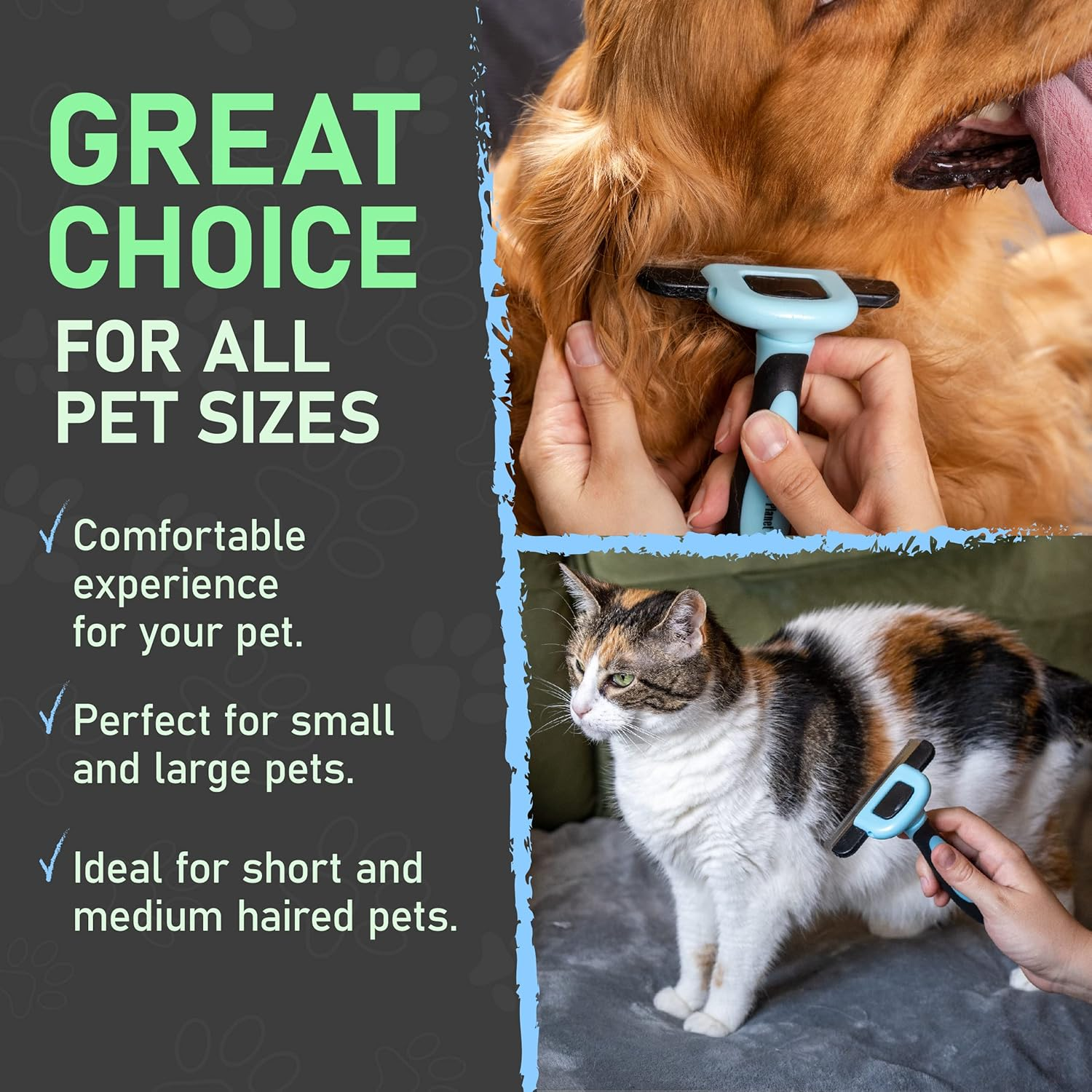 - COMFORTABLE AND EASY TO USE: Designed to make grooming easy, our dog and cat deshedding brush has a lightweight, convenient, non-slip handle that fits comfortably in your hand. The fur ejector button makes cleaning simple and mess-free!
